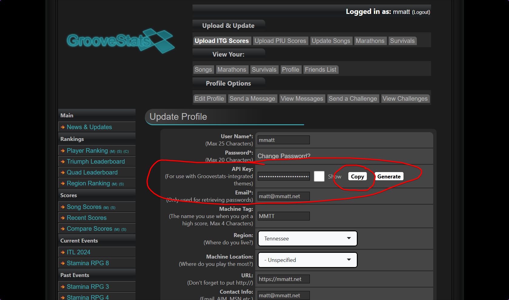 After signing in, you can find your GrooveStats API key under "Edit Profile". On the third line you'll find the entry for API key, if you don't have one already go ahead and click Generate, and then Copy to your clipboard.