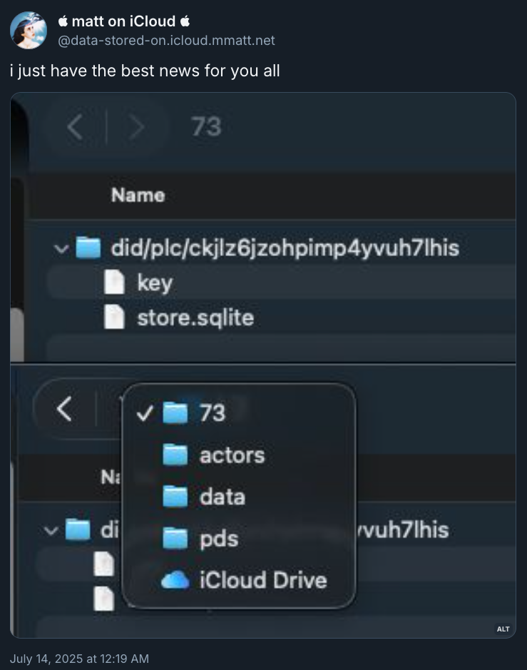 ln -s "/Users/matt/Library/Mobile Documents/com~apple~CloudDocs/pds" ~/Desktop/pds_shortcutI simply created a folder on my iCloud Drive called pds, in there I created a pds.env and then blobs and data folders.